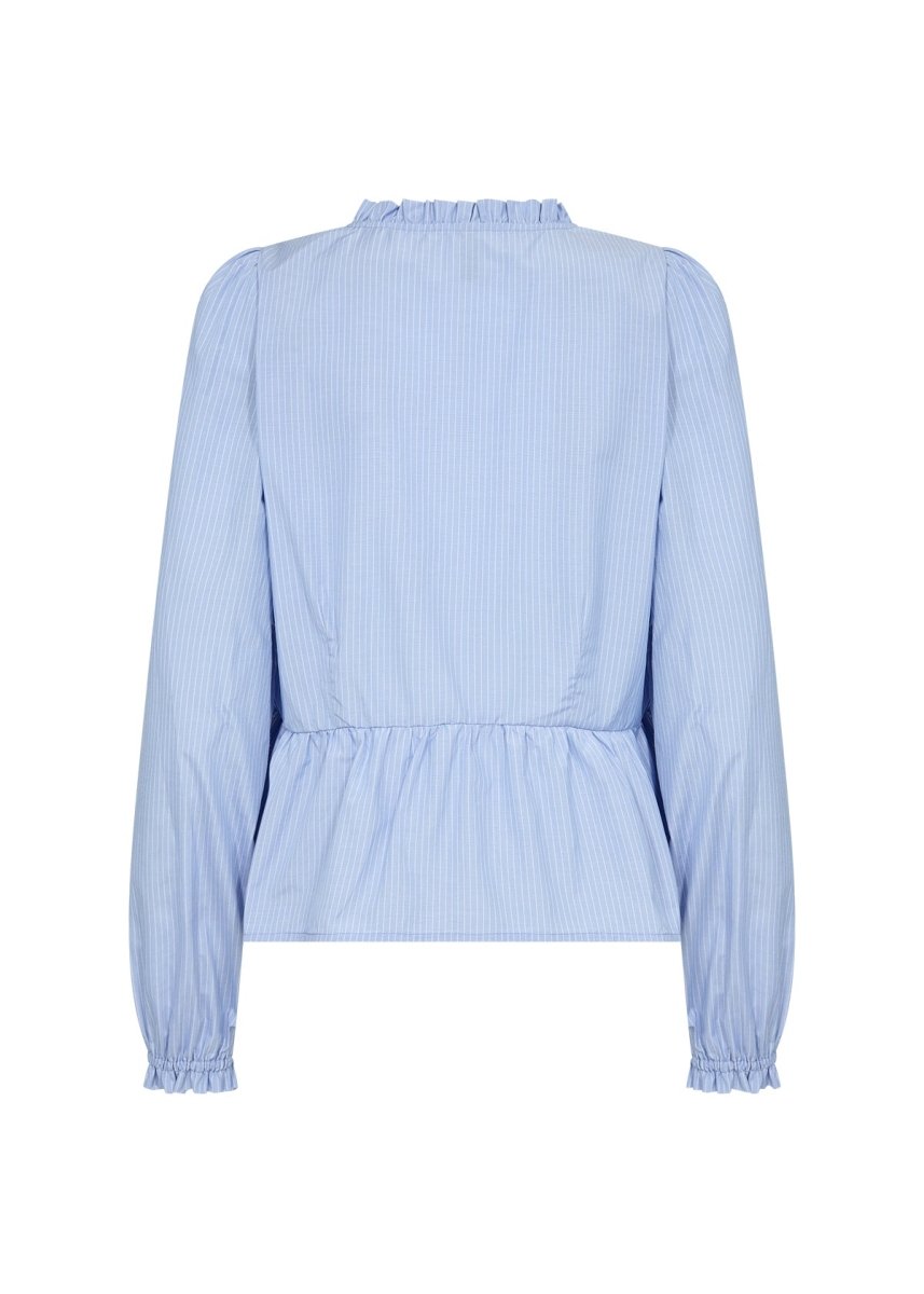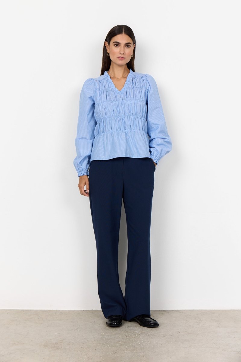 SC-Onari 3 is an elegant blouse made from a blend of recycled polyester and organic cotton. The blouse has a v-neck, long sleeves, a slightly cropped fit, smock at the front and a simple pinstripe print. Style it with some corduroy trousers and a pair of loafers for a nice look.