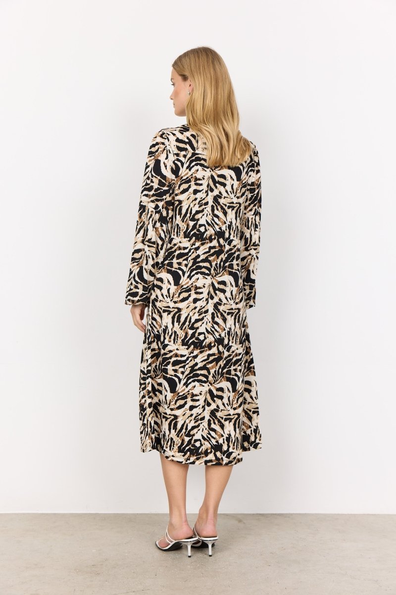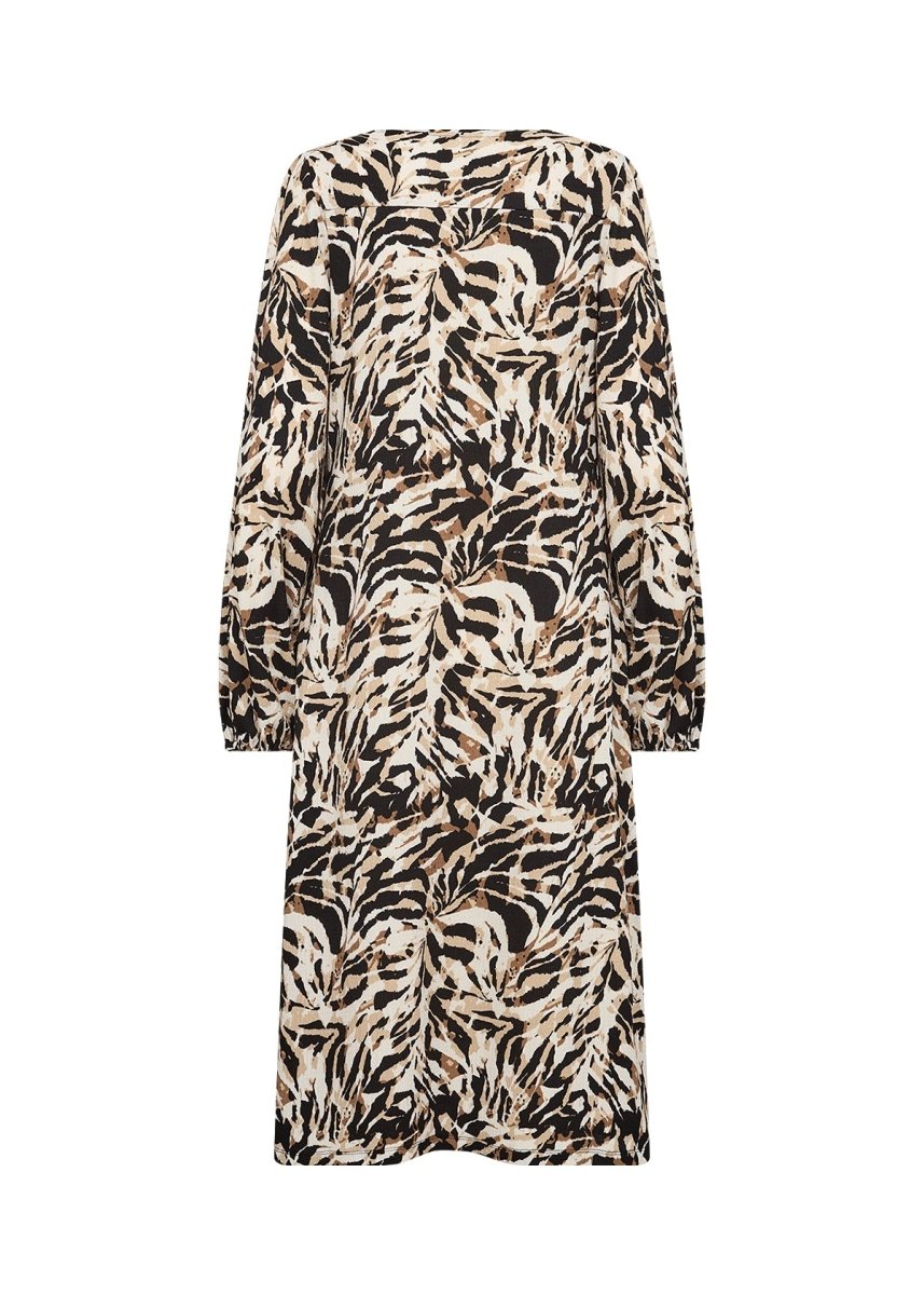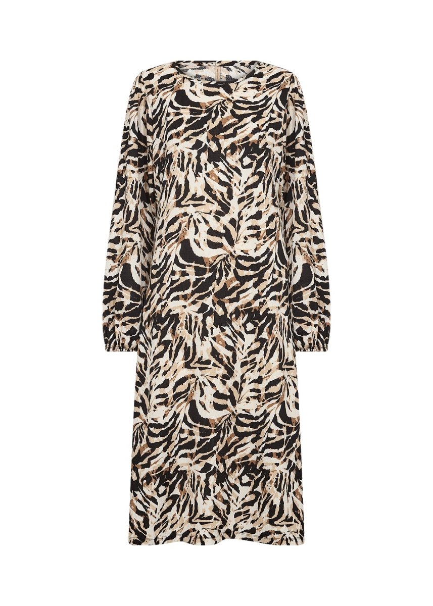 SC-PERLA 3 is a midi dress made of 99% Recycled Polyester, 1% Elastane. Featuring a bold animal print design, it has a round neckline, and long sleeves with elasticated cuffs. Pair this dress with smart flats or heels for a put-together look.