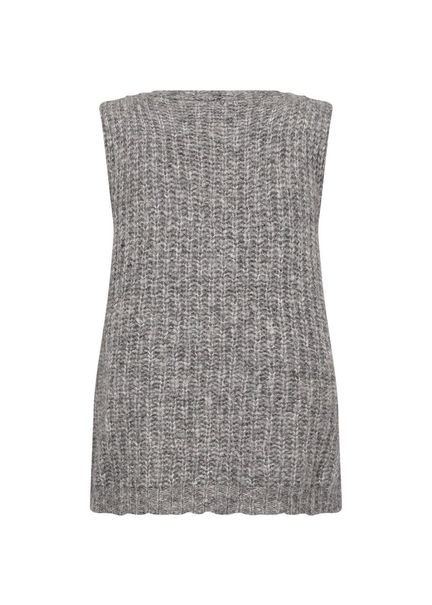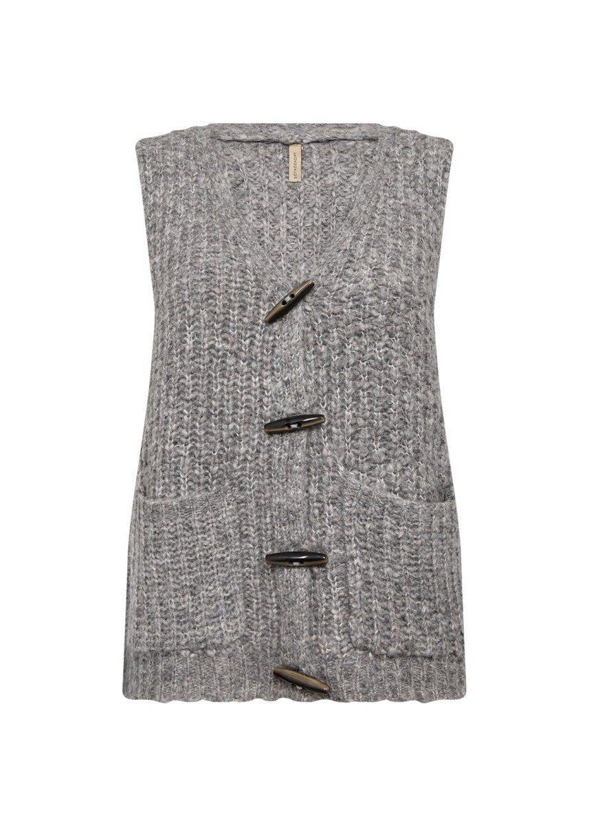 SC-VELA 1 Waistcoat is crafted from 65% Recycled Polyester, 23% Nylon, 6% Wool, and 6% Alpaca. It features a chunky knit texture with a V-neckline, toggle buttons, and front pockets. Pair it over a long-sleeve shirt or under a coat for added warmth and style.