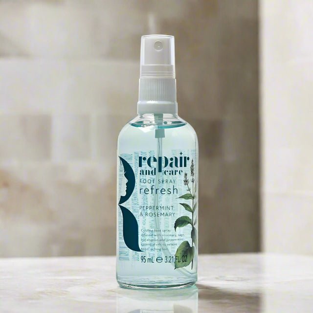 Give your feet a boost of energy with our Peppermint & Rosemary Foot Spray, a refreshing remedy for immediate relief. Experience a wave of coolness to awaken your overworked feet.