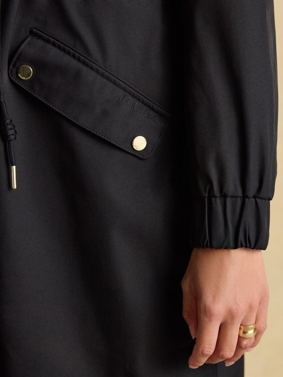 waterproof, chin guard, storm flap, waist adjuster, welt pocket, check lining under pocket flap, pu detailing, back storm flap, joules tab on back, deep elasticated cuff, side seams, drop tail hem, 2 way zip, joules cap on pocket flap, check half lining