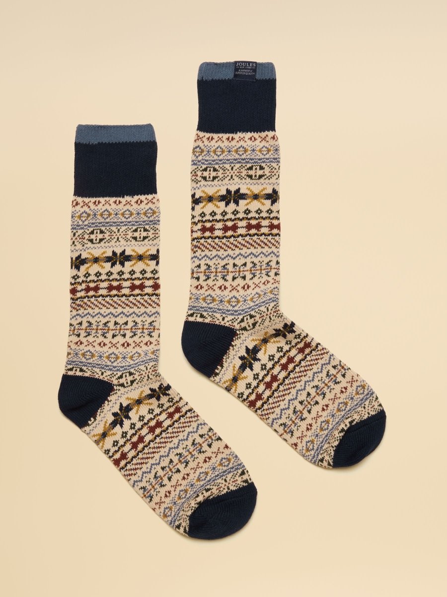 The kind of socks you'll feel confident to show off. We introduce to you our Alby Fair Isle pair. Crafted from a supremely soft cotton, they feature a traditional and seasonal Fair Isle pattern that was created by our in-house design team at Joules specifically for you. Finished with ribbed cuffs to ensure maximum comfort, we know this is a pair you'll continue to love for years to come.
