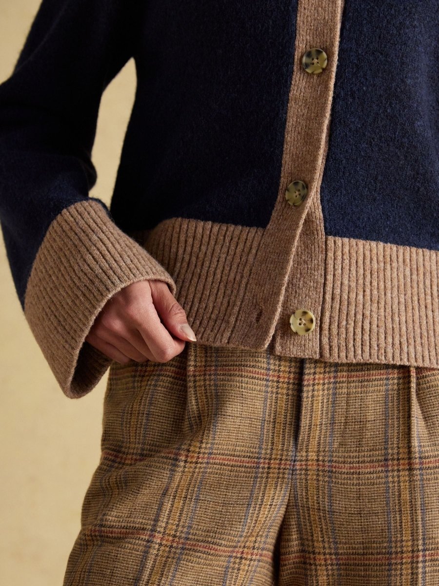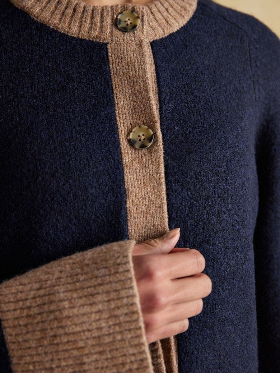 The Nora cardigan will add a pop of individuality to any outfit. Crafted to a boxy fit, it's designed with deep contrasting ribbed trims and classic saddle shoulders that both work to frame the piece perfectly. It's fastened with horn-style buttons and is crowned with a round neck.
