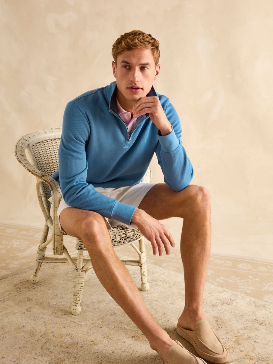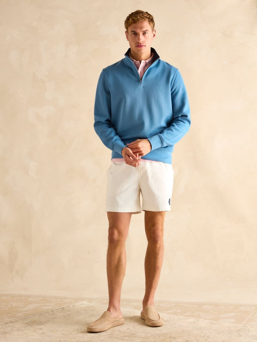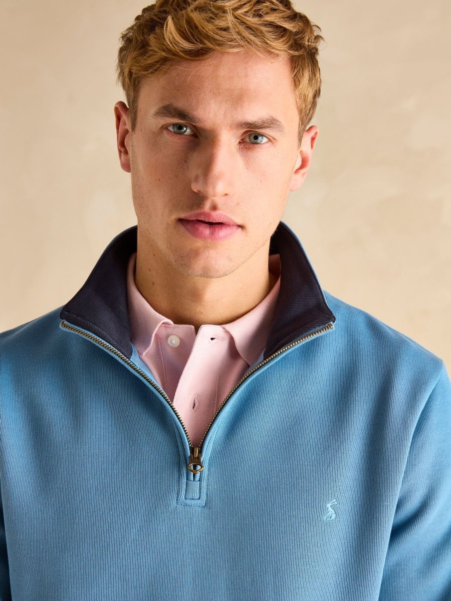 The fine French ribbed fabric ensures a soft hand feel, a quarter zip fastening with metal zip offers a classic touch and a contrasting collar facing adds interest.