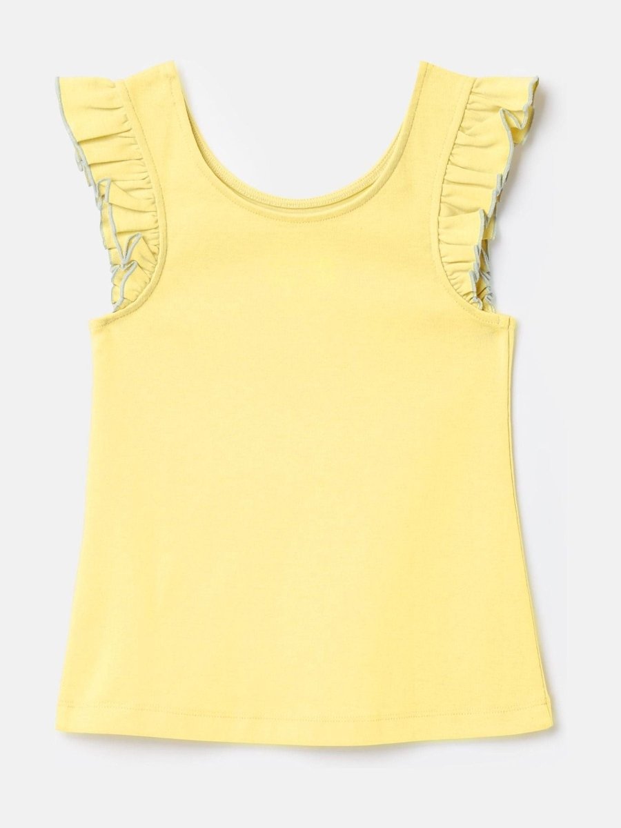 This is the vest top in yellow, elevated. Made from wonderfully soft cotton and in a raft of colours, this butterfly frill sleeve jersey top will be perfect for the warm summer months. No girl's wardrobe (or suitcase) should be without a few of these essential pieces.