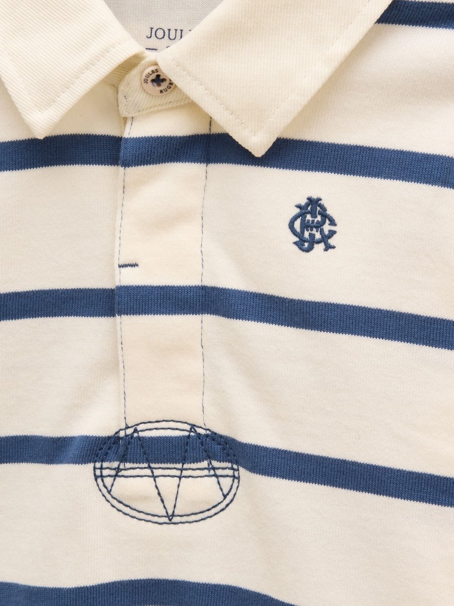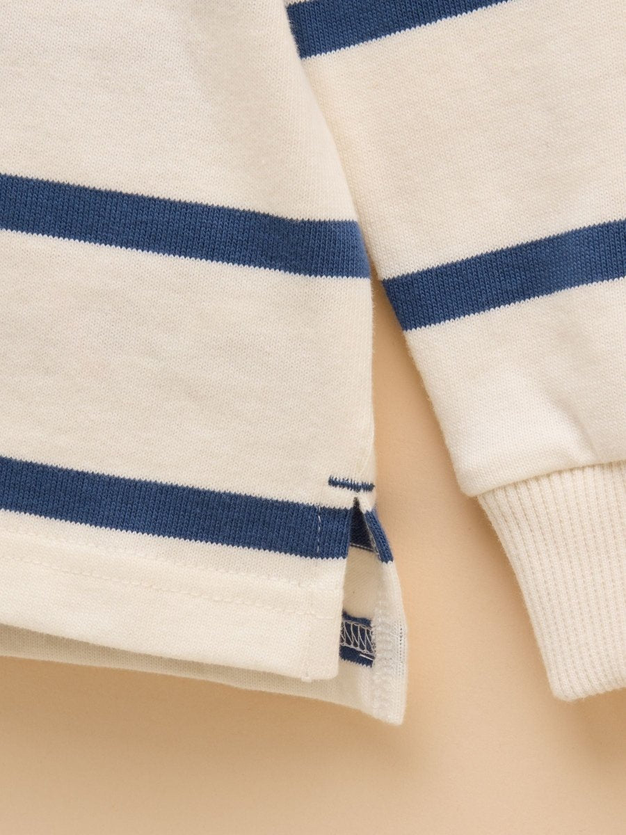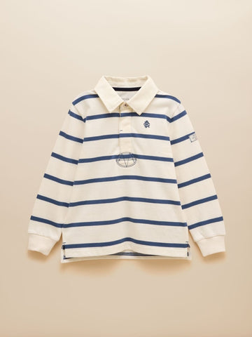 This boys' rugby shirt has a preppy yet sporty look. It features the hallmarks of a traditional rugby shirt including a heavyweight cotton jersey construction, a concealed placket with buttons, a pointed twill collar with undercollar stitching and wide horizontal stripes. Crafted with durable cotton, it's a hardwearing style that will be part his weekend wardrobe for a long time. It's finished with embroidery to the chest, side splits, ribbed cuffs and reinforced top stitching to the placket.