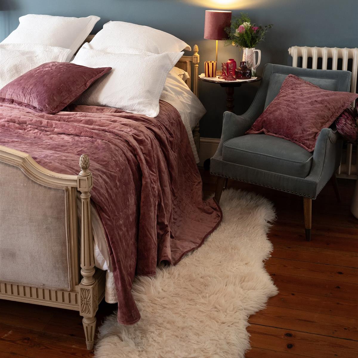A beautiful velvet bedspread in a dusky pink. Layer up your bed with our cushions or go for a contrast with our Windsor White pillowshams and cushions. This bedspread will generously cover your bed with around 2ft of drape on each side.