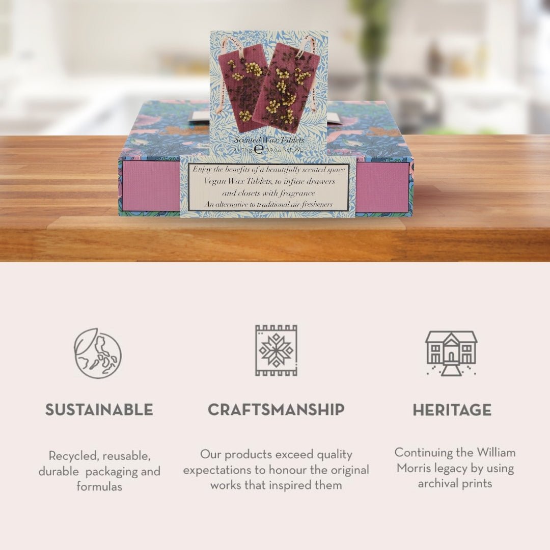 Tissue wrapped in a reusable Compton print box from the William Morris Gallery archives, these scented wax tablets make a perfect gift for her.