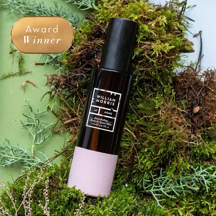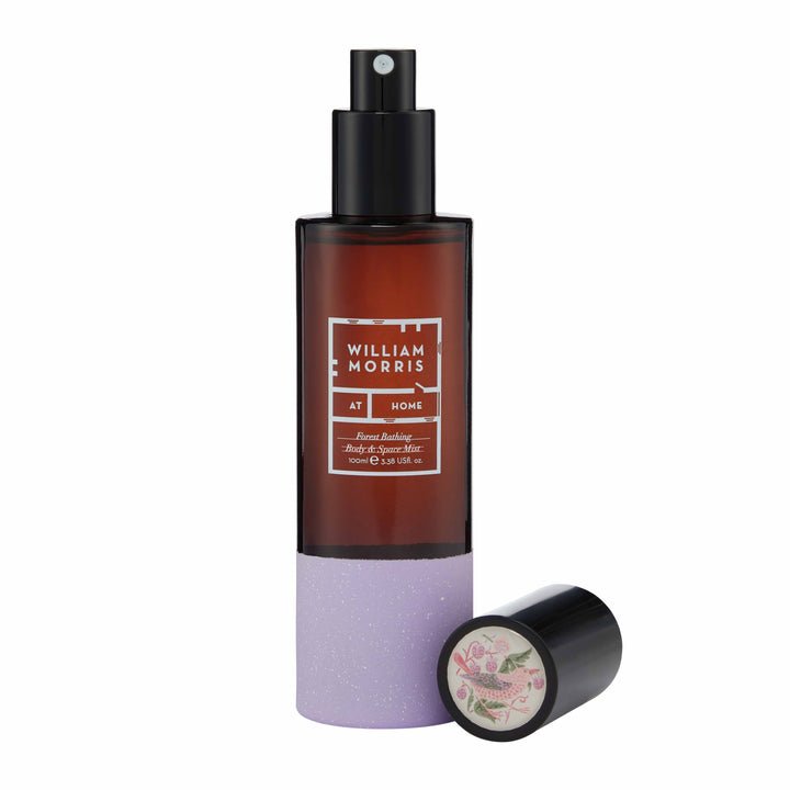 Extending the sensory elements of forest bathing: the glass bottle has a tactile stone finish and decorative aluminium cap with Strawberry Thief thrush inset inspired by Victorian pill boxes.