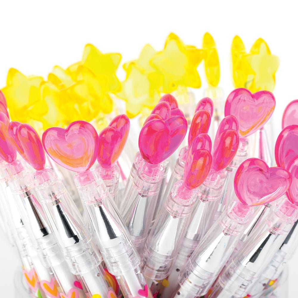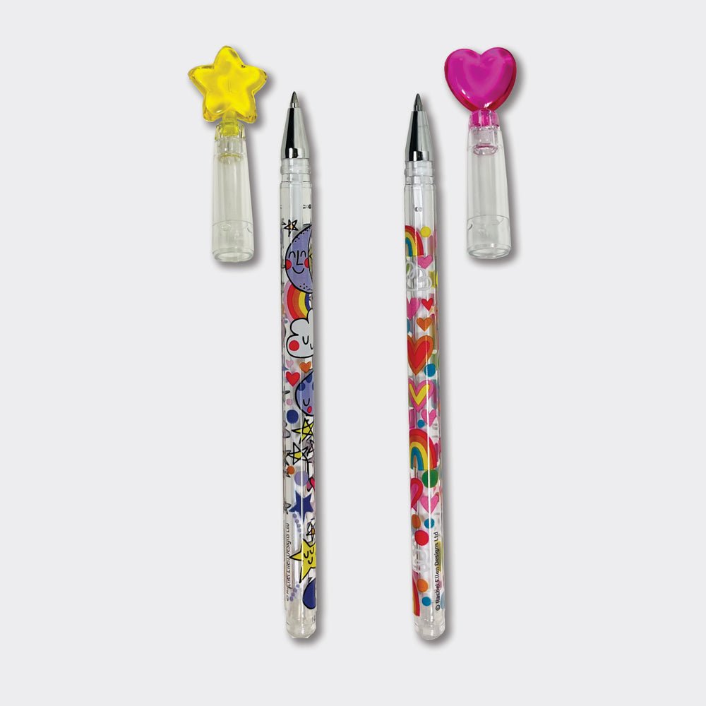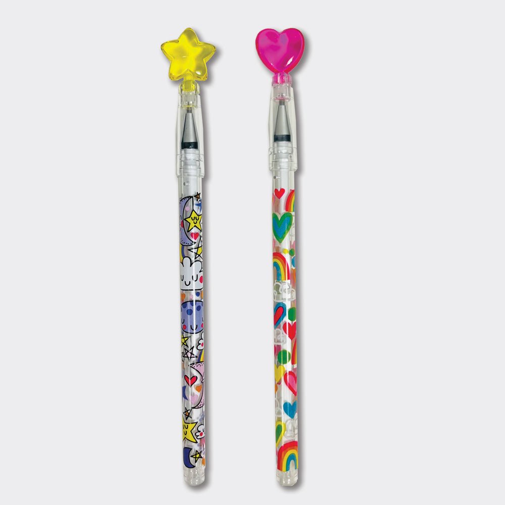 Colourful and fun gel pens in 2 designs (hearts & rainbows/stars & moons) with heart or star topper.
