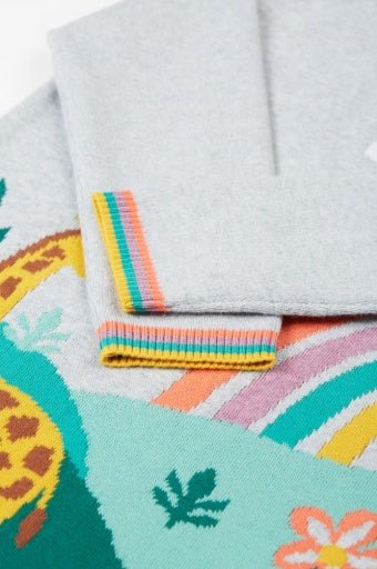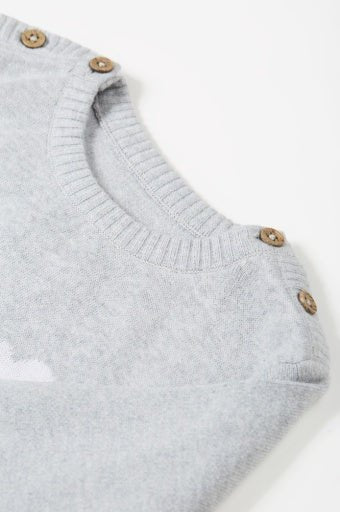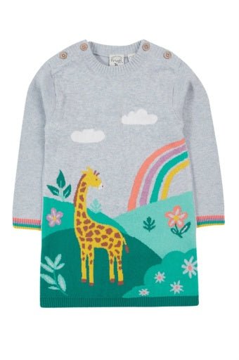 Long sleeved fine gauge knitted dress with jacqard design. Features button fastening shoulder plackets. GOTS Organic Certified by Soil Association Certification Licence Number DK22283. Part of the Frugi circular Recycle Me! Range, this garment can be recycled once it comes to the end of it's usable life