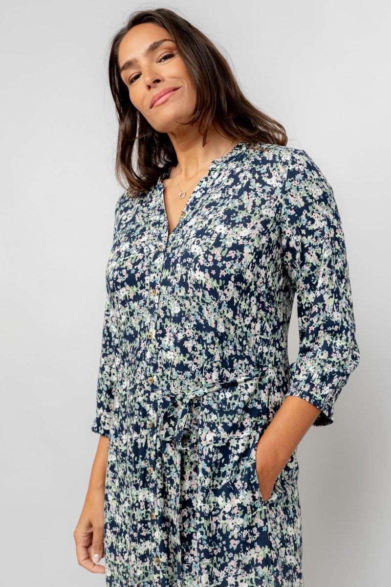 A beautiful floral ditsy shirt dress with a feminine scalloped collar, shirred bracelet length sleeves and a waist-defining belt tie.