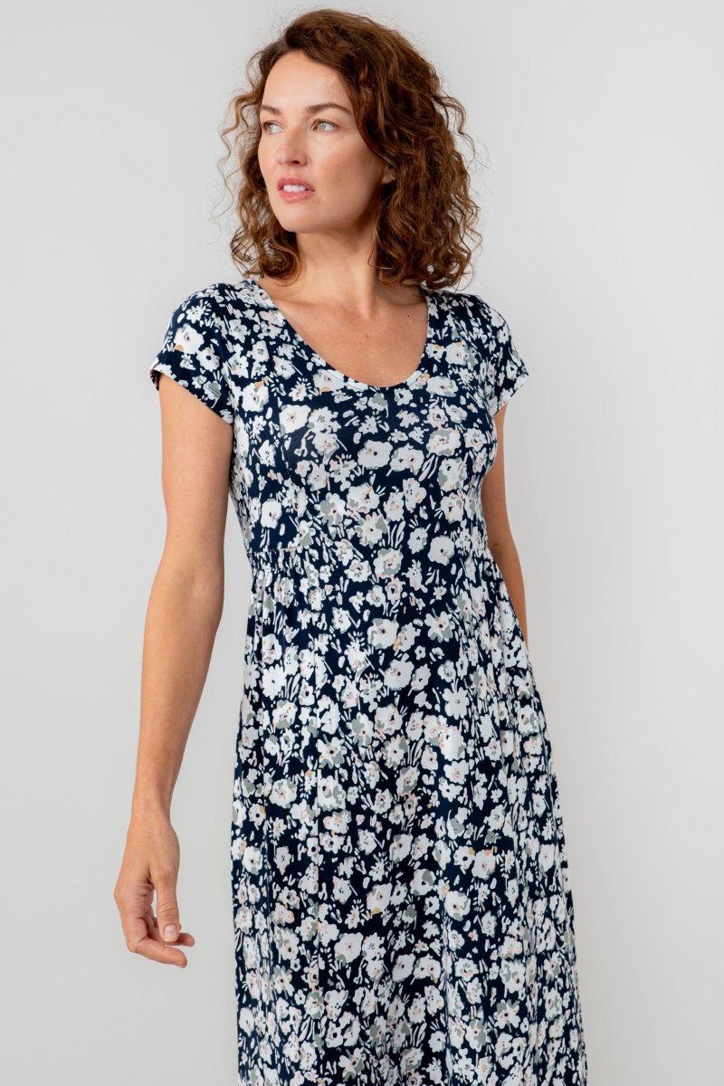The shirred waist gather creates a flattering feminine fit, whilst the stretch cotton jersey ensures comfort and drapes to skim the body. Add in a beautiful floral print and you have a winning combination!