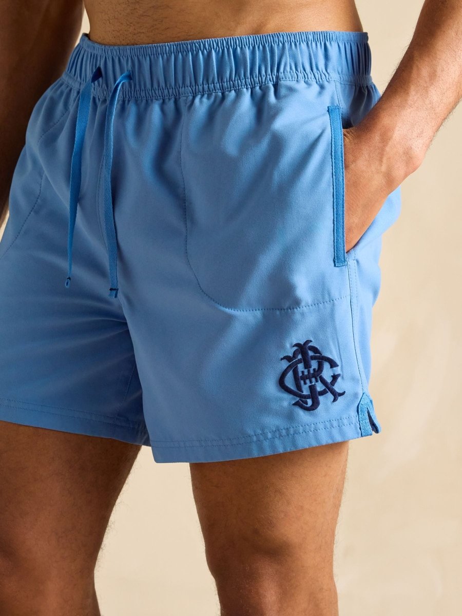 Take your swimming attire up a notch with our new rugby-inspired swim shorts. In the shape of traditional rugby shorts and complete with herringbone trims to the pockets and side vents, as well as Joules Rugby Club embroidery to the front, you'll want to wear these in more places than just at the pool and beach. Crafted from a quick drying fabric, (polyester is hydrophobic, meaning the water will not cling to it at all) with waist adjusters, two slip in side pockets, a zip back pocket and a mesh lining. When the games begin, you'll already be a winner. Swim shorts. Quick-drying fabric. Two slip in side pockets. Zip back pocket. Mesh lining. Rugby detail.