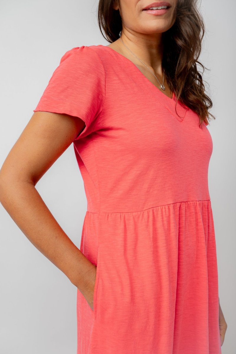 A soft v-neckline and slightly gathered cap sleeves add femininity to this easy-wearing dress. Perfect for early in the season with trainers and a denim jacket, or dressed up with sandals and statement jewellery