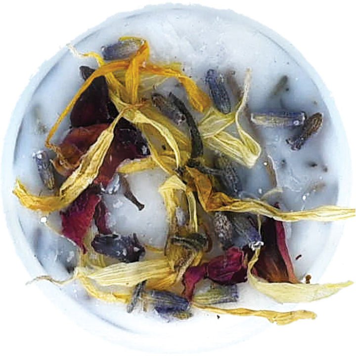 White Amber Musk Wax Melt - with marigold, lavender and rose buds and petals and comforting pure cedar wood and nutmeg essential oils.